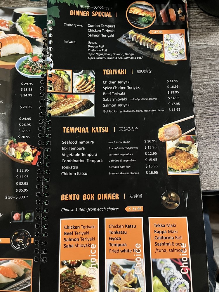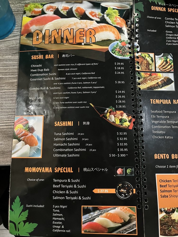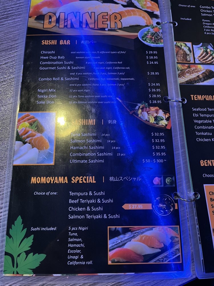Introducing the menu at Sushi Momoyama, a Japanese sushi bar located in Concord, CA. This establishment offers a variety of options including bento boxes like Saba Teriyaki and Combo Tempura with CA Roll, Sashimi, and Fried White Fish. With a casual and intimate setting, Sushi Momoyama provides an ideal dining experience for both small groups and parties. Customers rave about the delicious food and top-tier presentation, with standout dishes such as fresh salmon sashimi and generous sushi rolls. The menu also caters to vegetarians and vegans with limited options available. Overall, Sushi Momoyama stands out for its quality, portion sizes, and excellent service, making it a go-to spot for sushi lovers in the area.